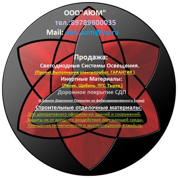 ООО"АЮМ" Продажа: Дистрибьютор ТМ Интессо в Крыму. Светодиодные Системы Освещения. Инертные материалы(Песок. Щебень. ПГС. Тырса.) Строительные отделочные материалы — декоративного оформления зданий и сооружений, защиты их от вредного воздействия окружающей среды, улучшения эксплуатации сооружений. ...