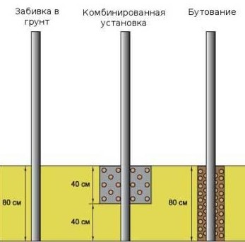 Когда верхний слой почвы отличается рыхлостью, то применяется частичное бетонирование столбов. Необходимо выкопать ямы всего на 40 см, а затем забивать в них стойки еще на глубину 40—50 см. Затем дно подсыпать щебнем и залить бетоном до уровня земли.