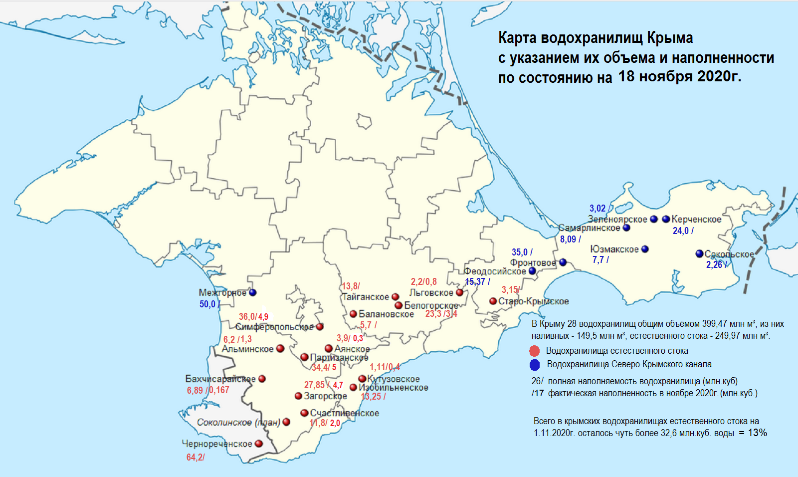 Всего в Крыму в годы Советской власти построено 23 водохранилища общим объемом 399,47 млн м³. Из них 15 – водоемы естественного стока (объём – 249,97 млн м³), а 8 – наливные водоемы Северо-Крымского канала (объёмом 149,5 млн м³). Таким образом, в Крыму (РК и Севастополь) средний дефицит воды составляет около 150 миллионов кубометров в год или более 400 тыс куб.м в сутки.