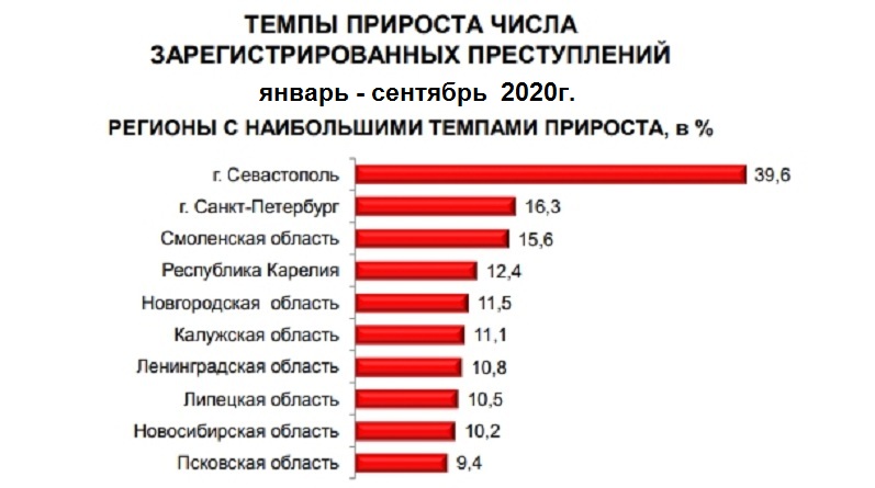 Лидерами России по темпам прироста зарегистрированных преступлений с начала 2020 года стали Севастополь, Петербург и Смоленская область. Об этом свидетельствуют данные отчета о состоянии преступности в стране за январь – сентябрь, размещенного на сайте МВД РФ.